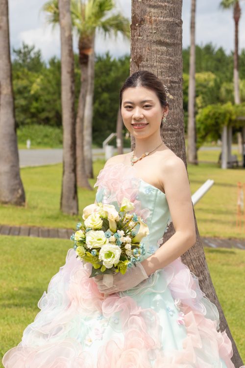 ドレス姿が自然の中で美しく映えます。